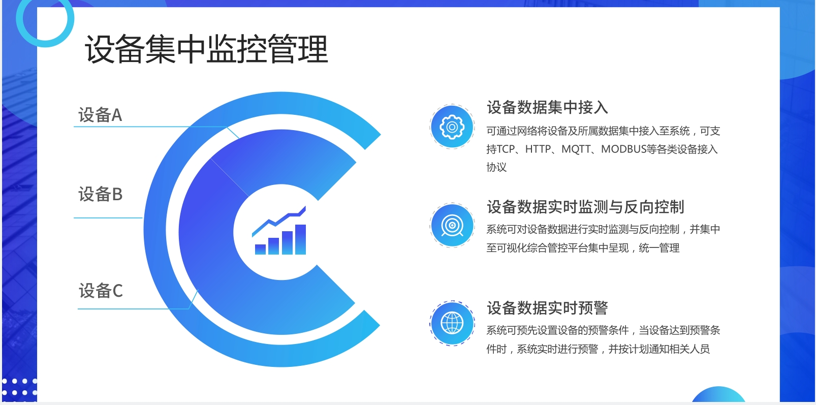 设备数据通过网络或第三方平台设备数据接口,统一接入物联网设备管理系统。可帮助企业更加及时且直观的了解设备的运行状况,提高设备正常工作时间,减少意外停机并提高维保工作效率,让维保管理更简单。